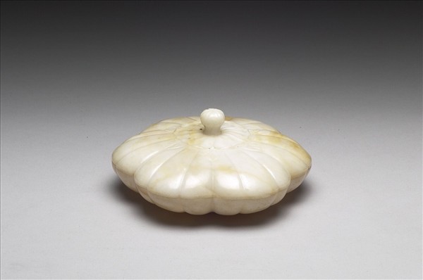 玉質,雕作六瓣花形盒,盒身與盒蓋約等厚,底部與蓋面中央都琢作平展的六瓣花,都圍繞六片小葉。蓋鈕雕作花蕾形。盒內分七格,曾盛裝某種食物,內壁上留下許多褐色痕跡。