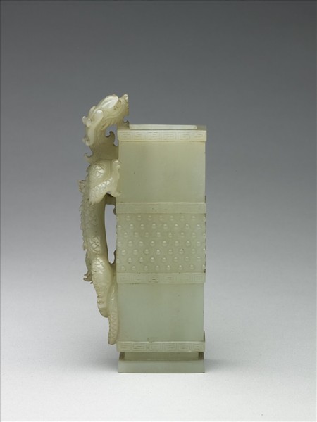 玉質,色泛白。全器為扁長方形,口沿至圈足口徑一致,器旁立雕一龍獸,獸口啣於口沿。器腹中央為一周乳丁紋,上下接有回紋,口沿及器下部也都有回紋一周。