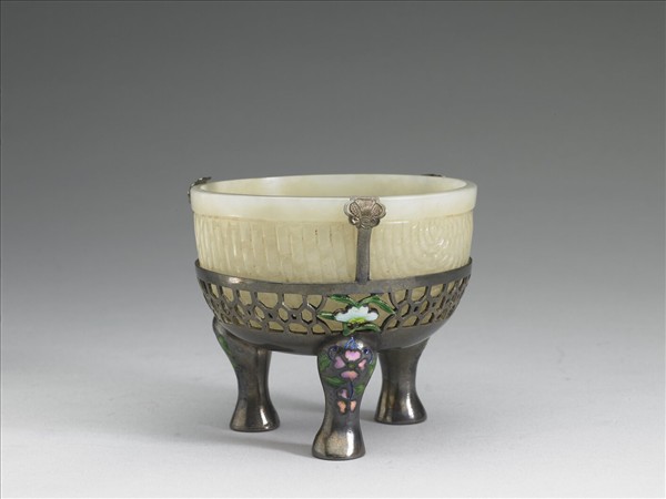 玉質,有綹。仿草編花籃,器外壁刻劃編織紋路。下有金屬鏤空托座,下接三蹄足,在三足上填燒琺瑯花葉裝飾。