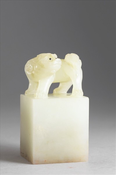 玉質,青色。印璽,長方形,頂立雕一隻異獸,姿態生動,以墨點畫雙眼。印面陰刻篆書四字「八徵耄念」。