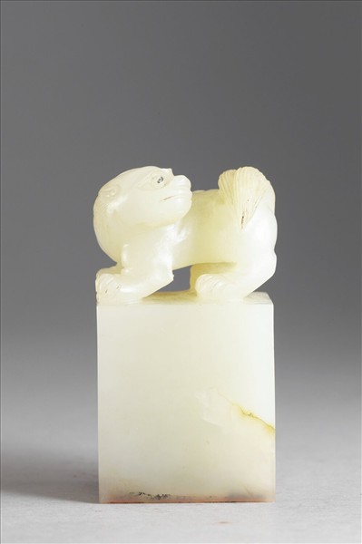 玉質,青色,局部泛黃赭斑。印璽,長方形,頂立雕一隻異獸,以墨點畫雙眼。印面陽刻篆書三字「漱芳齋」。