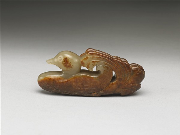 青黃玉料,含有大量三氧化二鐵,致使大面積呈現紅糖色。一般俗稱「糖玉」。此一造形明顯是遷就原有玉料作厚片形,琢成一蹲伏的鳳鳥,長尾捲翹至鳳首後方。本器置於〈清鴛鴦形蒔繪 盒〉中。