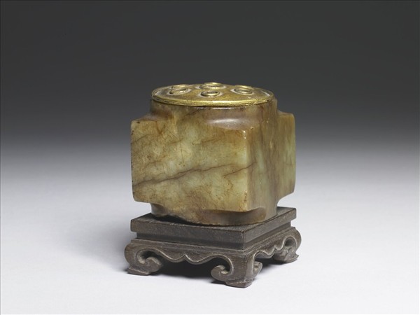 灰青色帶褐色玉質,器身布滿褐絲,盤紅光澤。內圓外方琮形,四面平直,射頸略短,頸內圈圓外圈不甚圓,孔內壁拋磨平滑,射口切斜,造成相對邊不等高。附銅膽,鏤孔銅蓋。