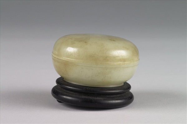 玉質,帶赭斑。蓋與器身略相等,弧形壁,有圈足。口沿處有一周凸棱,光素無紋。附木座。