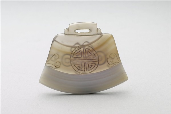 瑪瑙,半透明灰褐色有白色絲紋。片狀器,似鐮刀造型,長底邊做圓弧狀且略琢銳,首部凸出長方形孔以佩掛,雙面分飾團形壽字與盤長結。火鐮為古人隨身攜帶打火器具,本件仿其造型但不具實際功能。