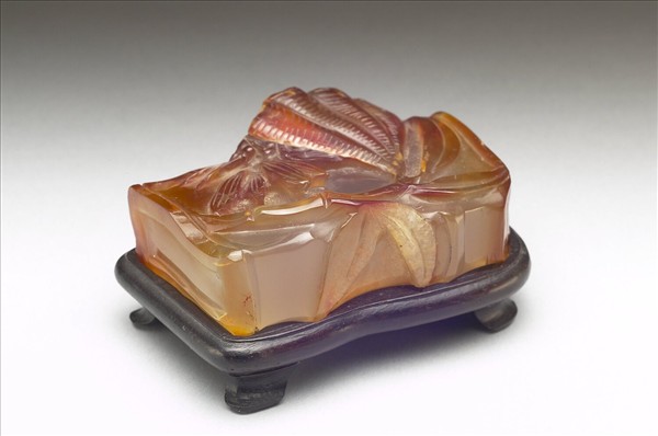 瑪瑙,半透明灰白至橙紅色。略呈長方形,雕作竹節一段,上淺浮雕細竹枝葉,並飾折枝花葉。有紫檀木座。
