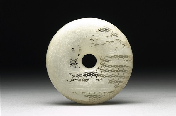 玉質,色青白,細膩光潤。環形盒狀,體形扁圓豐厚,器與蓋大小相同,雙面皆鏤雕連續曲線紋,其餘分淺浮雕水岸邊小舟上一人橫臥小憩,與松雲高山中壯少二人遠眺。香囊中空部份可放花瓣或其他香料,供隨身攜帶。