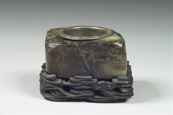 玉質,夾雜枯澀的灰赭色它種礦物。中廣矮方柱體,上下射口短淺而圓渾,外方內圓。邊壁平直而高度不齊。光素無紋。清代配做附有銅膽、木座。