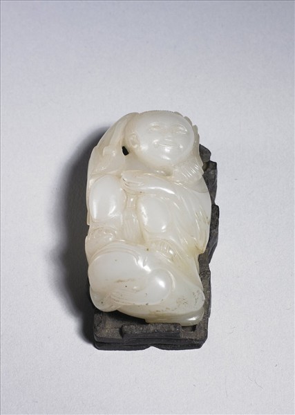 玉質,有少數赭斑。作一人物,蹲坐在蟾蜍上。描繪「劉海戲金蟾」場景。劉海為道教傳說中的神仙人物,時常手撒金錢給人代來財富,帶有富裕吉祥之意。附木座。