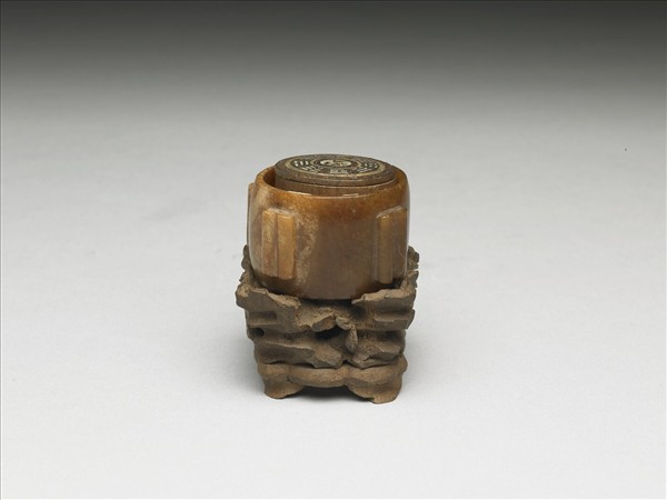 玉質,呈深褐色。圓管狀,上下對穿大孔,外壁琢四個雙凸直棱裝飾。下承木座,中填以八卦紋蓋木膽。