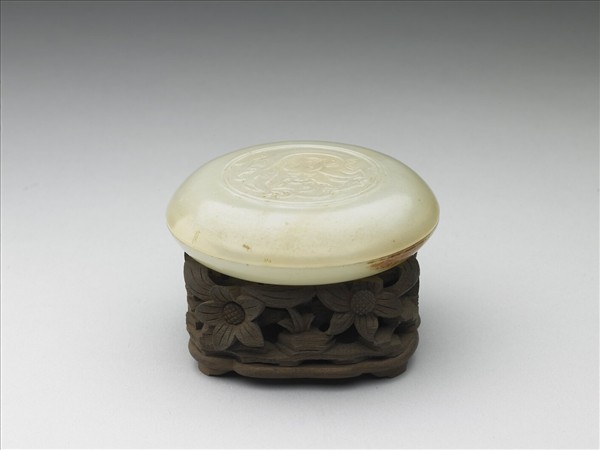 玉質有赭斑。蓋與器身略相等,弧形壁,有圈足。蓋面淺浮雕龍紋。附木座。