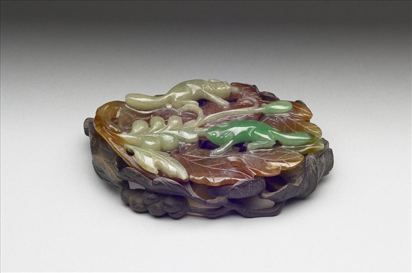 翡翠,半透明赭色間翠綠及灰綠色。全器雕葉形片狀,上琢捲曲藤蔓與果實串,趴伏長尾松鼠二隻。本件利用翡翠天然俏色,表現不同子題與深淺,活潑俏皮,並有穿孔供佩掛。附雕葡萄藤木座。