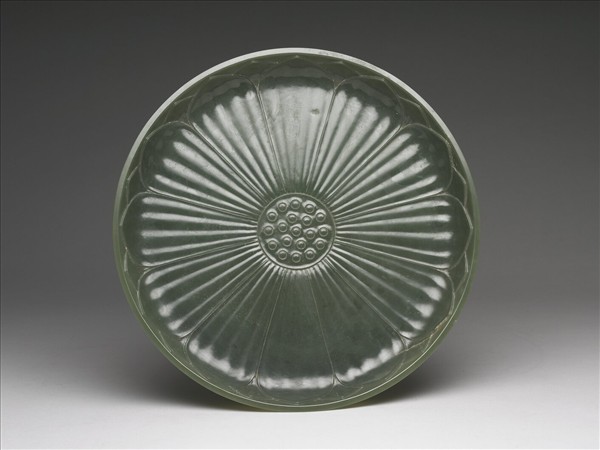 玉質,淺口大盤,口沿微外卷,淺足。盤面刻作複瓣蓮花正視面,盤心即為蓮心,紋飾簡諧對稱。