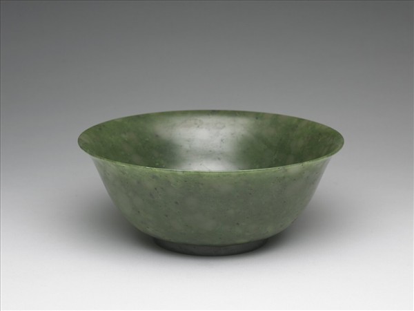 碧玉碗,呈色碧綠,間有白斑。侈口,深弧壁下斂,圈足。外壁光素無紋。