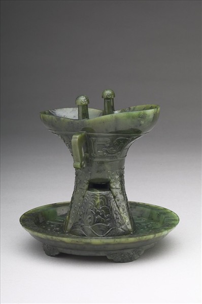 承盤敞口折沿,弧壁下斂,四獸面足。承盤中央高起一上窄下寬的柱體,柱面刻福山壽海,並有三個等距分布的豎槽,恰可置放並固定玉爵。爵與承盤外底均見「乾隆年製」雙行四字篆款。