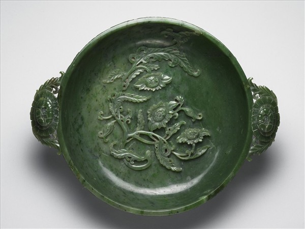 色深綠,敞口,深弧壁,雙耳帶活環,平底。整器以花卉為主要裝飾主調,如外壁滿飾卷枝花葉,耳亦為花形,器內底則淺浮雕一株折枝花,折枝花枝葉扭動多姿,花朵盛開相對,如顧盼呼應之狀,是全器紋飾最值得注目之處。