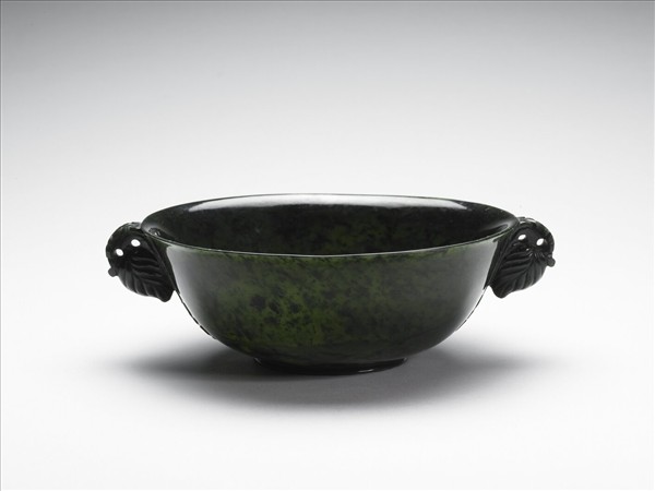 不勻的深碧綠玉。琢作一圓碗,碗底雕琢一平展的罌粟花,交叉覆疊四片花瓣,周圍繞一圈莨苕葉。自兩側下方沿著腹壁向上伸長莨苕葉至口沿處,捲折下垂一朵花蕾。