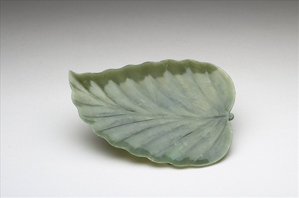 碧玉質。雕成波緣狀葉片,葉緣微捲,器面淺刻葉脈。筆覘的功能,是在筆毫含墨飽滿時,可在其上覘試,調節墨的乾濕,勻整筆頭形狀。