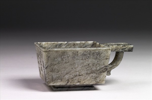 玉質,方斗杯,單把,口沿陰線刻一道。把上以及杯壁三面各刻古篆文。底有四字篆款「乾隆年製」。