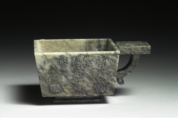 玉質,方斗杯,單把。把上以及杯壁三面各刻詩文。底有四字篆款「乾隆年製」。