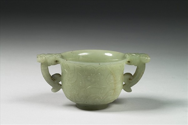 玉質,杯形,口微侈,有圈足。雙螭耳,螭面平,杯壁琢四螭、卷雲。底有四字篆款「乾隆年製」。
