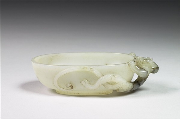 橢圓形的器身,右側有一兼具裝飾紋樣及扳把功能的螭,其前肢攀附於口沿,器底有陰刻單行橫書篆字「雍正年製」款。