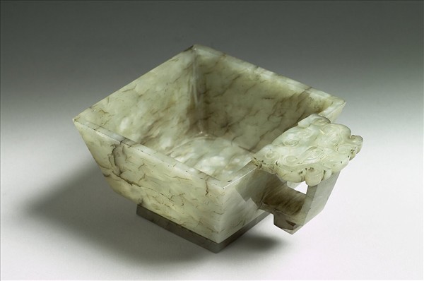 玉質,帶條狀斑。方斗杯,單把,高圈足。把上琢一獸首,獸首平,下有垂珥。底有四字篆款「乾隆年製」。
