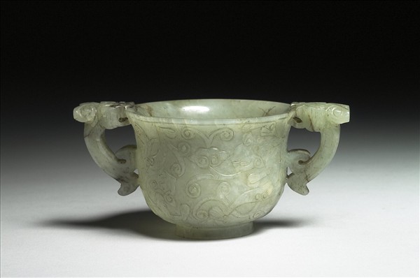 玉質,有璺。雙耳琢龍首,口微侈,有圈足,器身飾螭、卷雲。底有四字篆款「乾隆年製」。