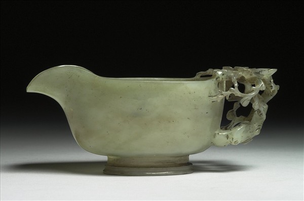 玉杯,仿青銅「匜」的造型,有流、把手、圈足。全器光素無紋,惟把手雕梅花兩枚及枝幹。底有四字篆款「乾隆年製」。