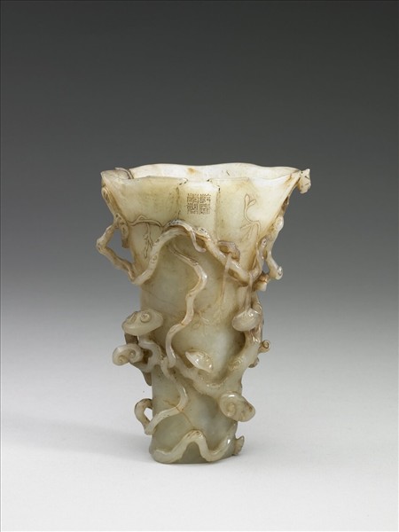 白泛赭色,多處有璺,器作犀牛角杯形狀,靈芝、蘭藤攀緣器壁。芝蘭相交,有「君子之交」之意。近口沿處刻四字篆款「乾隆年製」。