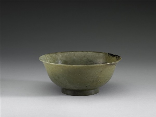 玉質,帶黑點斑,有裂紋。口微侈,有圈足。全器光素無紋。底有四字篆款「乾隆年製」。