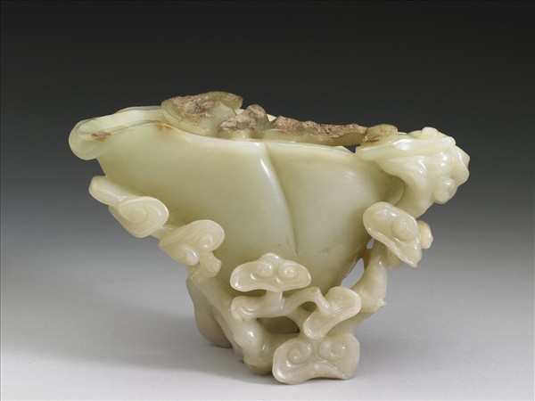 玉質。器作九靈芝托著角形杯,器形厚實,上端利用玉皮雕一蝙蝠。九朵靈芝為所謂「九如」,蝠與福同音,此器有聚集人生幸福的吉祥意味。