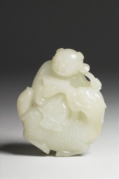 童子坐於麒麟之上,一手持如意,一手捧書,麒麟下顎長鬍鬚,身遍佈魚鱗,鬃毛大尾,寓意河圖洛書的典故。