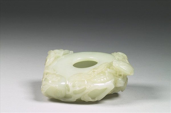 玉質,圓形水盛,用以貯水,為文房用具之一。周圍飾石榴、蟬,陰線刻葉脈。