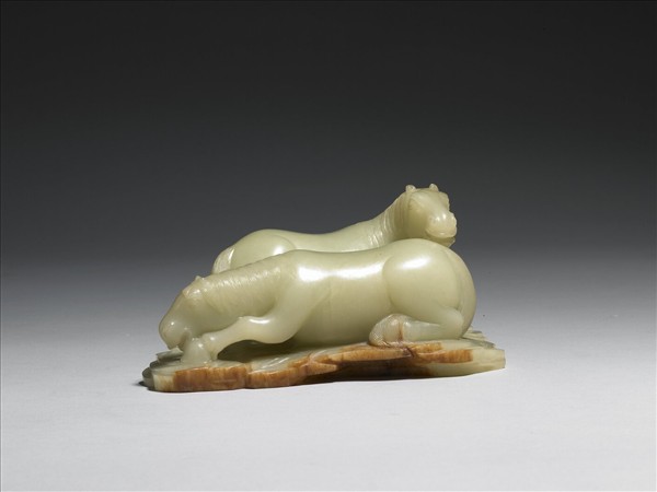 帶赭色玉皮。雙馬跪坐於岩石之上,一馬休憩,另一匹舉首觀望。