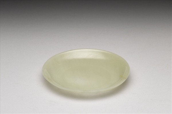 光潔的青白玉,琢一淺圓盤,有一條已沁為褐色的裂痕。外壁雕蔓連花葉,器底雕平展花朵,但在花瓣與葉片表面,並未真正磨出凹窩,只是用較寬的陰線刻兩道。應是擬模仿土耳其玉器上的圓凹雕,卻未諳其內涵。本器為新疆回部作品。