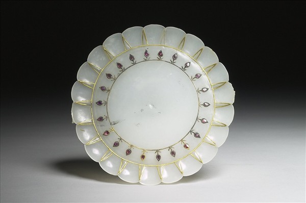 青白玉,原本琢一有雙柄的花邊圓盤,雙柄已斷,斷口處未經仔細磨平。圓周上雕一圈短花瓣,每片的花瓣兩側各刻一直槽,但只有正面在直槽內嵌了金絲。盤心又以灰色金屬絲與紅寶石鑲嵌一圈小花束。金屬絲上可能曾包覆金箔,但目前金箔多已脫落。本器為印度作品。