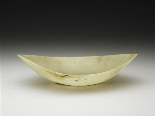 玉質,泛黃色。琢一兩端翹的舟形盤。底部也配合器形將平展的花朵做成兩端尖的果核形。外壁分三條平行裝飾帶,上、下緣的窄帶均雕連續折線,形成三角紋。中段雕垂直弦紋。兩尖端淺浮雕莨苕葉紋。