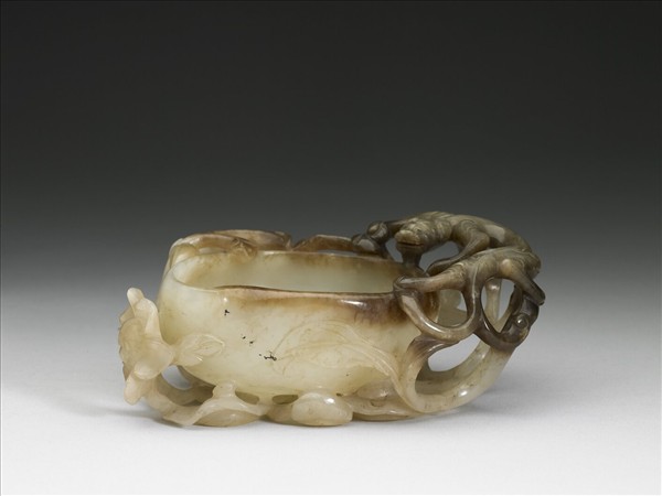 青灰帶褐色。桃形洗為洗的一種樣式,為文房用具之一。器作半個桃形,把琢一盤螭,螭尾與枝莖、桃葉相纏繞,佈滿器底。