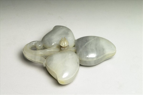 玉質,有黑灰斑。小扁盒,內分三格,作三桃形狀,以卷枝相連,蓋鈕雕成一朵小花。本器為印度作品。