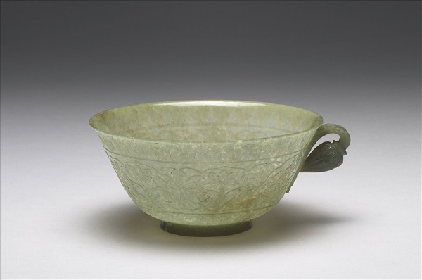玉質,琢一侈口深腹圓碗,圈足。與典型蒙兀兒玉碗兩側自腹壁下緣開始雕琢由粗到細、向上延伸的莨苕葉紋的作法不同,這件玉碗只在一側器壁中段貼飾一枚兩端尖的葉紋,上端延伸出一下垂的花蕾。葉紋與花蕾都雕琢得相當生硬。腹壁上、下緣各浮雕圖案化莨苕葉紋一周,腹壁中段雕琢開窗圖案,每個開窗內雕一束花卉。開窗式花紋結構流行於土耳其的玉器上,且常將花瓣或葉瓣磨成圓凹狀,但此件玉碗的花瓣雖也磨凹,但在圓凹面的中央還留一直條凸線。整體觀察可知,此碗應屬受土耳其影響下的印度作品。