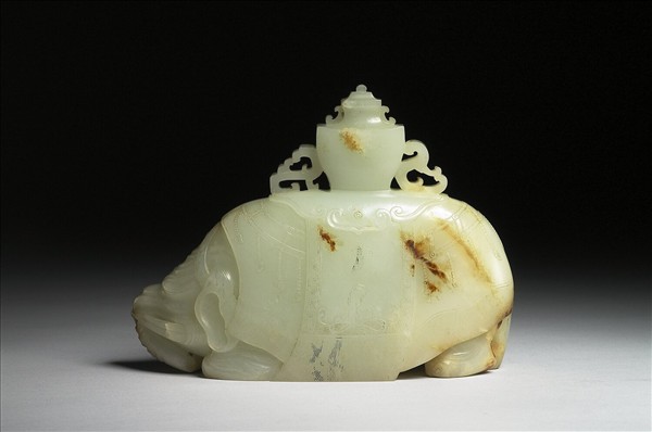 玉,帶赭班,琢一隻大象,作跪臥狀,大象披覆華麗,背負著寶瓶。象,取其形貌,瓶與平同音,有「太平有象」之意。