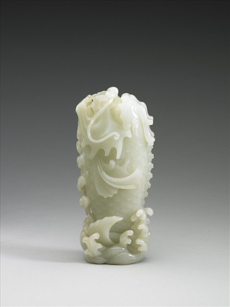 玉質。此花插作一鰲魚躍出水面,另有如意雲紋、火球紋。