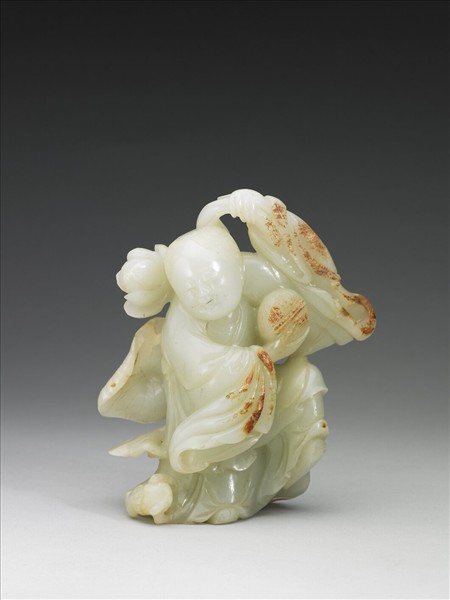 玉質。笑容滿面的仙人,一手持荷花,一手持盒子,除了「和合」二字具吉利含意,還有「蓮生貴子」的寓意。