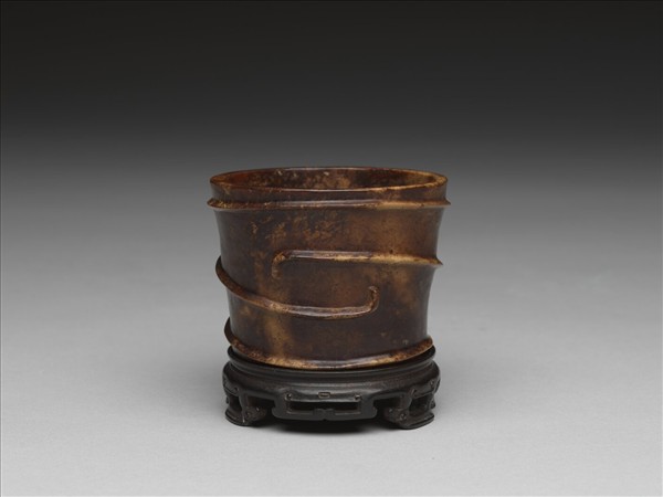 上大下小的圓筒缸形,器身與器底非一體成形,底為加嵌。環器飾以凸弦紋,凸弦紋是晚明仿定窯瓷器所形成的裝飾特徵。原玉材屬深青綠色的青玉,表面經燒烤,或使用時加熱,故呈深淺不一的紅褐色。玉器作色仿古流行於當時。
