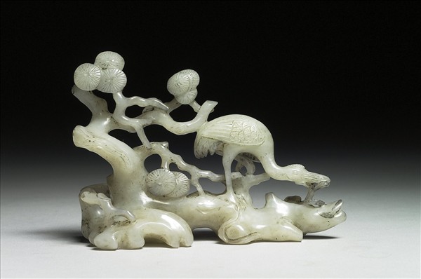 一鶴口啣靈芝,立於松下。此器於底部樹幹上琢有四字篆款「乾隆年製」。