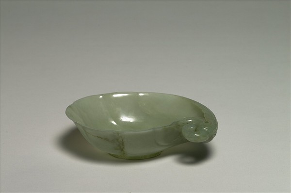 淺豆綠色,雕做半個瓠瓜形。從柄端向器底伸出莖、葉,浮雕一朵盛開的似薔薇的六瓣花,花瓣外緣自然捲起。
