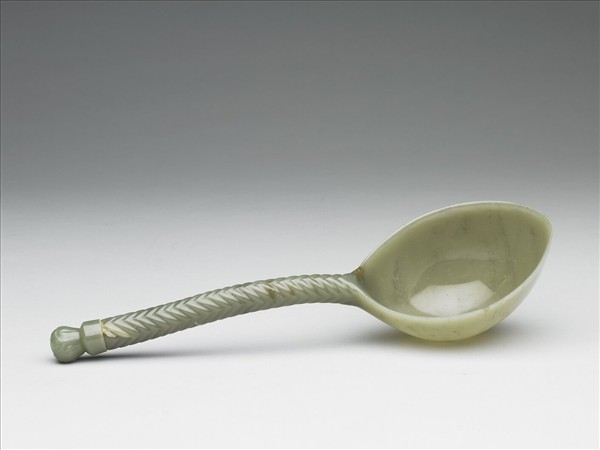 豆綠色玉,琢一長柄杓。杓與長柄是一塊玉雕成,長柄上雕平行三角紋。但柄端另有雕一花蕾的柄套。此杓為鄂圖曼帝國作品,於乾隆三十五年(1770)貢入清宮,乾隆皇帝為之賦詩,杓底加琢御製詩四十字:「掌非周玉府,攻自泰西瀛,絕勝舒州杓,何須力士鐺。璞原誤荊國,蕊特豔昌城,試問宜誰贈,應調傅說羹。」詩末刻「乾隆庚寅春御題」七字及「比德」璽文一方。