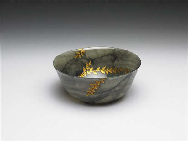 深淺交雜的灰玉,琢一深腹圓碗。碗底琢成圓片形。不規則地貼飾用金箔剪成的鳳尾草紋樣。本器為印度作品。