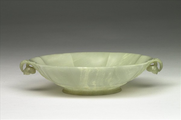 淺青綠玉。琢作一盛開的八瓣花形圓碗。腹壁下緣琢一圈寬葉紋。碗底特殊,底心雕平展的葵花,圍繞似向外翻捲的圈足,圈足內外壁雕花瓣與葉紋。自兩側下方沿著腹壁向上伸長一莨苕葉至口沿處捲折,下方垂一半開的花朵。本器為蒙兀兒帝國作品。